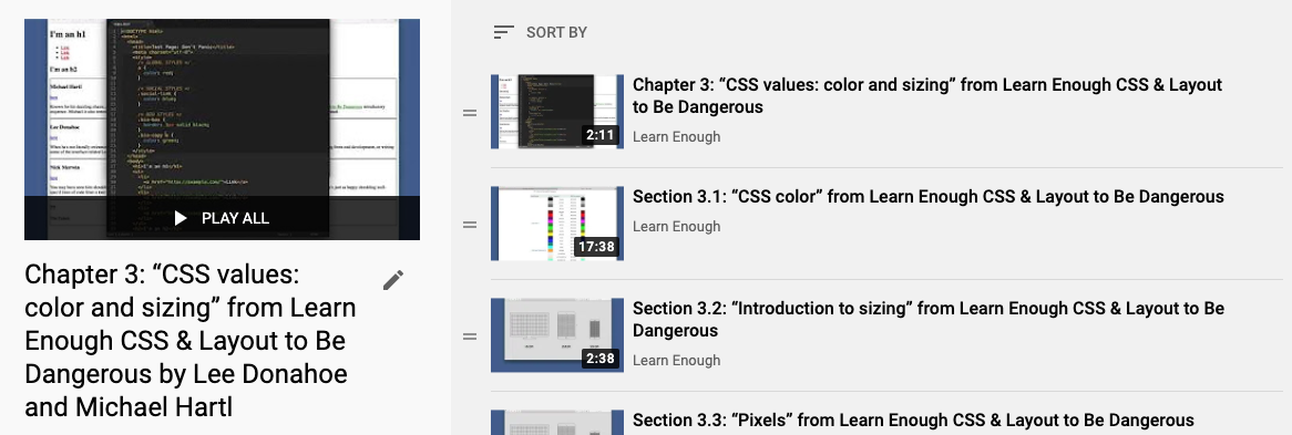 The videos are useful by themselves—they include more than 2½ hours of content—and also give you a good idea of what’s included in a subscription to the Learn Enough CSS & Layout course (which includes streaming videos for all 10 chapters).