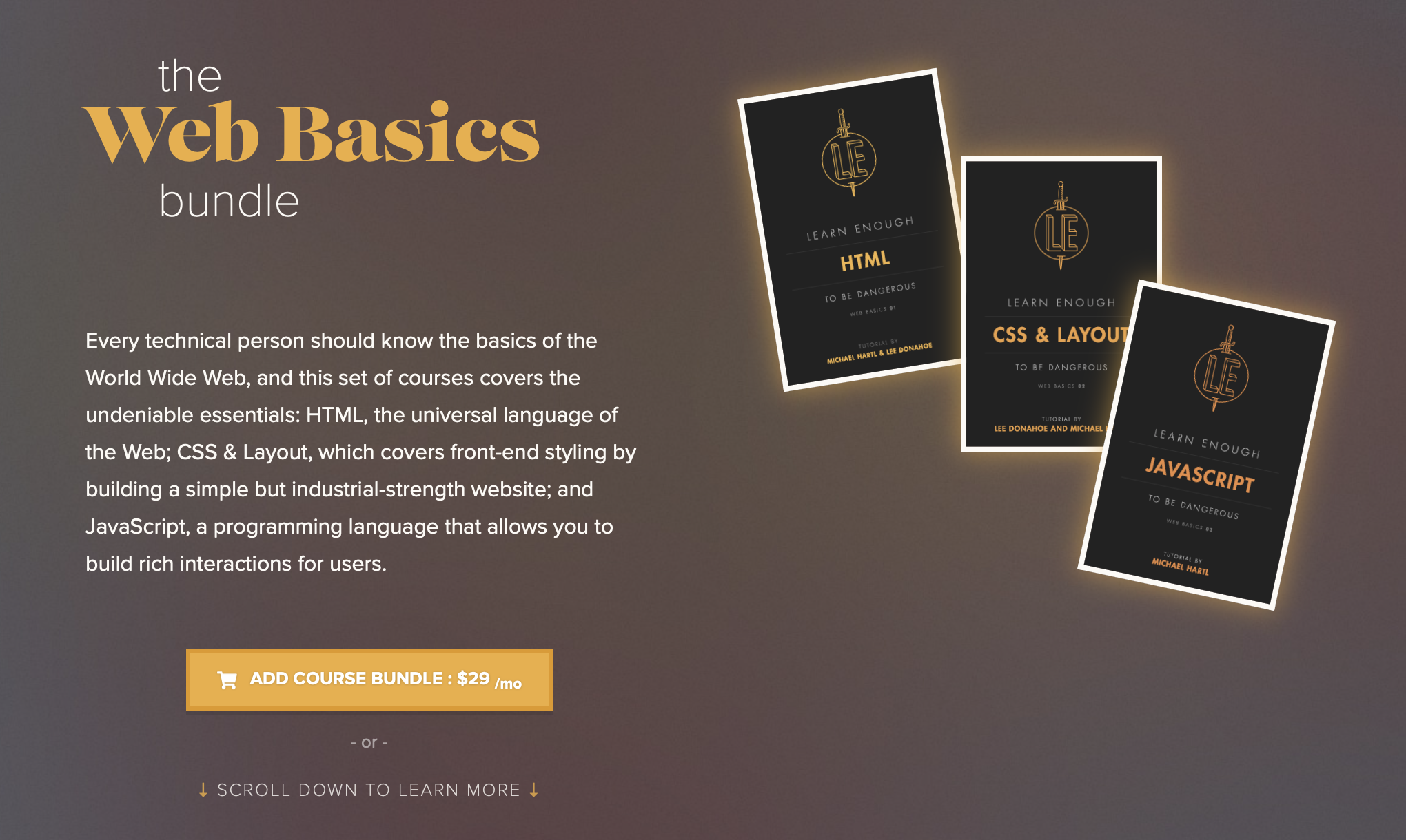 The good news is that Learn Enough JavaScript fits in beautifully with the Web Basics Bundle. Not only is JavaScript—the programming language of web browsers—clearly a “web basic”, but Learn Enough JavaScript also builds directly on the sample website developed in Learn Enough CSS & Layout.