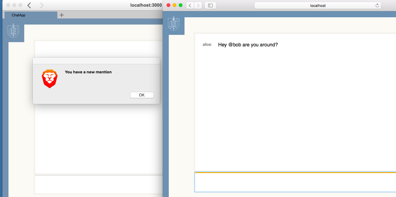 For example, consider a chat app written using HTTP. Alice (Figure 4)5 and Bob (Figure 5)6 each type in their respective chat boxes (Figure 6). When Alice submits a message, there’s no way for Bob to get it without refreshing his browser. As a result, the traditional solution for HTTP chat is to use polling, whereby the client runs a program (typically in JavaScript) to pull in any changes every few seconds.